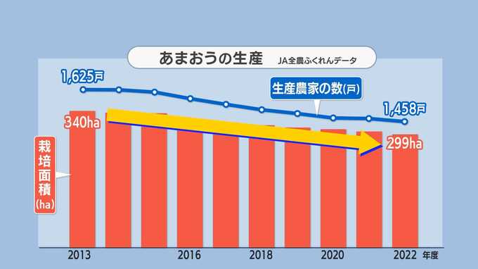 生産力の低下も大きな課題となっています。あまおうの販売が開始された2003年度には、生産農家の数は2143戸でしたが、2022年度には1458戸まで減少。420ヘクタールあった栽培面積も299ヘクタールにまで縮小しています。県が2015年に行った調査でも65歳の以上の高齢農家が約37%に上り、年々高齢化が進んでいるとみられています。このまま栽培面積とともに出荷量が減ってしまうと、消費者が目にする機会が減って市場での評価が下がってしまうおそれがあるため、生産力を維持するために新規就農者の増加と育成は重要な課題となっています。