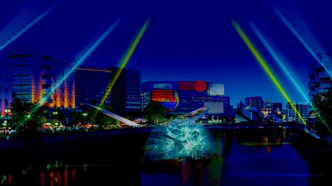キャナルシティ博多の近くにある清流公園には、大きなウイング状の建物やイベント広場などが整備され、夜は水と光のショーが楽しめる公園に。