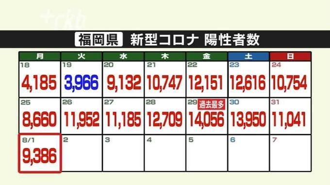 新型コロナ陽性(1日)福岡県9386人、佐賀県1093人 2022年8月1日(月) 17:47 国内 福岡県は1日、新型コロナウイルスの検査で新たに9386人が陽性だったと発表しました。月曜日としては過去最多です。発表自治体別の内訳は、福岡市が1547人、北九州市が1523人、久留米市が291人…