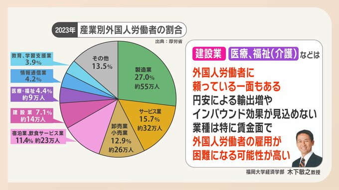 福岡大学経済学部木下敏之教授「2024年問題で人手不足が懸念される建設業・医療・福祉などは外国人労働者に頼っている一面もある。円安による輸出増やインバウンド効果が見込めない業種は特に賃金面で外国人労働者の雇用が困難になる可能性が高いと思う」