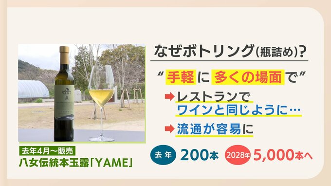 2023年4月から販売を開始した八女伝統本玉露のボトリングティー「YAME」。ボトリングにすることで、ワインと同じ流通経路が使用できるというメリットもあります。2023年は200本の限定販売でしたが、協議会は、2028年には5000本の生産・流通を目指すとしています。発祥から600年を迎えた八女茶。福岡から世界へ、新たな挑戦は続いています。