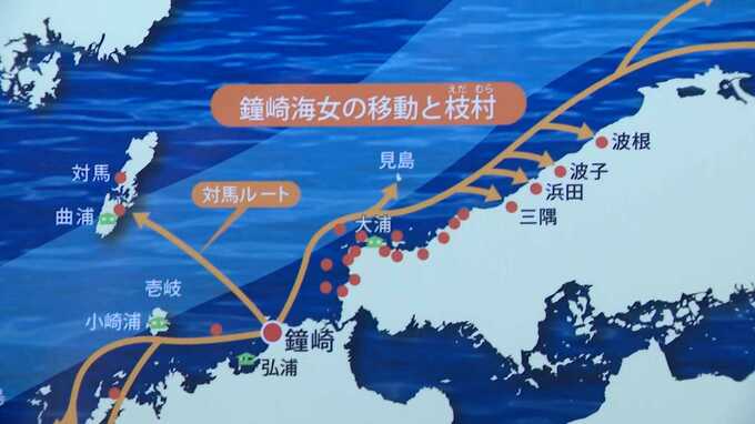 良い漁場を求め各地に出稼ぎに行っていた鐘崎の海女は、対馬海流に乗って700キロ離れた能登半島にも移動していました。