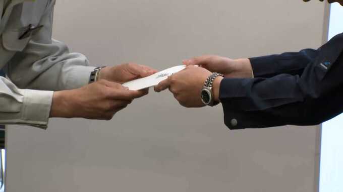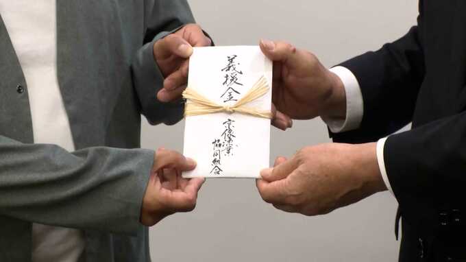 宗像市の一行は、18日午後、輪島市役所を訪れ、輪島市海士町の自治会に対し、宗像漁協から461万円、宗像大社からおよそ100万円の義援金を手渡しました。