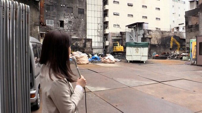 本田奈也花アナウンサー「火災現場から約200メートル歩いて3分ほどの場所にあるのが、今年1月火災が発生した、鳥町食道街です。現在も重機によるがれきの撤去作業が進められています」
