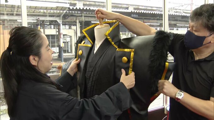 23日午後、JR小倉駅のホームでは、「ド派手衣装」を手がけるレンタル衣装店の店長、池田雅さんが、4点の衣装を飾り付けました。