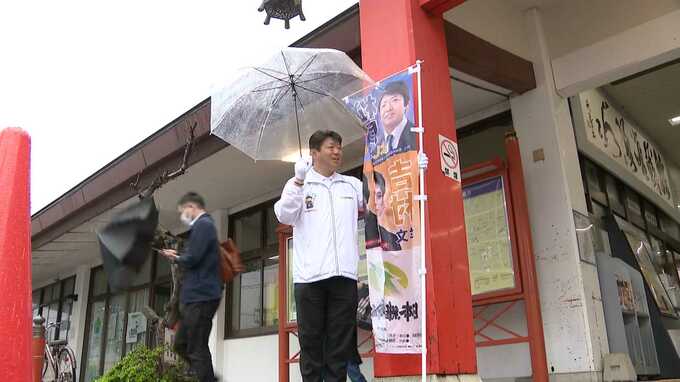 その堤氏の事務所の目と鼻の先で挨拶をしていた維新の松尾嘉三氏(55)。