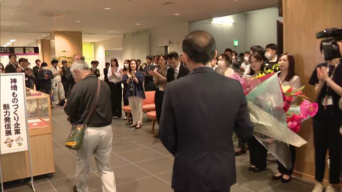 神埼市の實松尊徳市長は30日朝、市役所に初登庁し、職員たちから大きな拍手で迎えられ花束を贈られました。