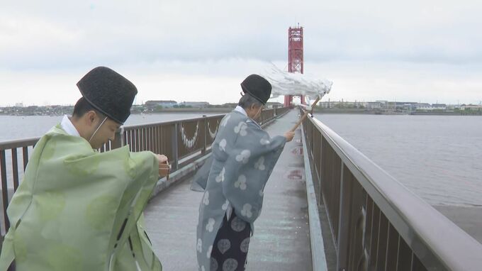 式では、弘法大師が川に流したアシの葉がえつになったという伝説に基づき、参加者がアシの葉を流し、酒を注いで、豊漁と遊覧船の安全を祈願しました。