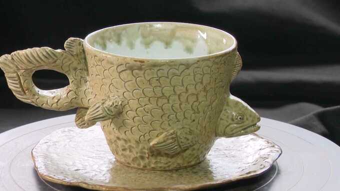 焼き上がった「シーラカンス」のカップ。目やうろこ、持ち手となっている尾びれなどが生き生きと表現されています。