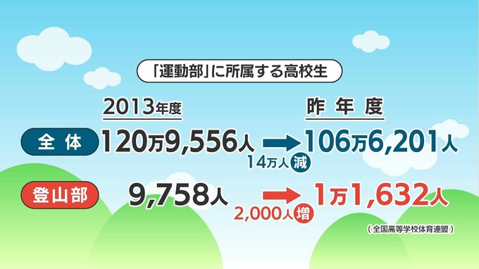全国高等学校体育連盟によると2023年度、運動部に所属する生徒の数は106万人あまりで、この10年で約14万人減少しました。一方で「登山部」の部員数は9758人から1万1632人と、約2000人増加しています。