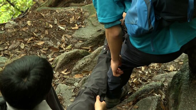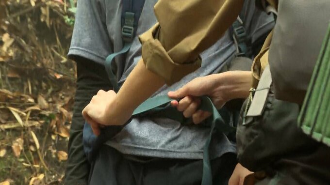 修猷館高校・山岳部 主将 岡崎哲太さん「ひもを締めれば締めるほど楽になると思ってもらっていい。ザックは、体に密着していた方が楽になる。いったん止まろうか」
