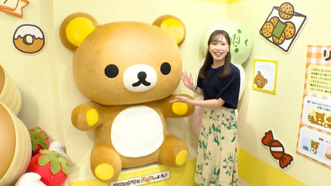 RKB竹井りさリポーター「会場入ってすぐ正面に大きなリラックマがいます。このように抱きつくこともできるんです。モコモコしています」