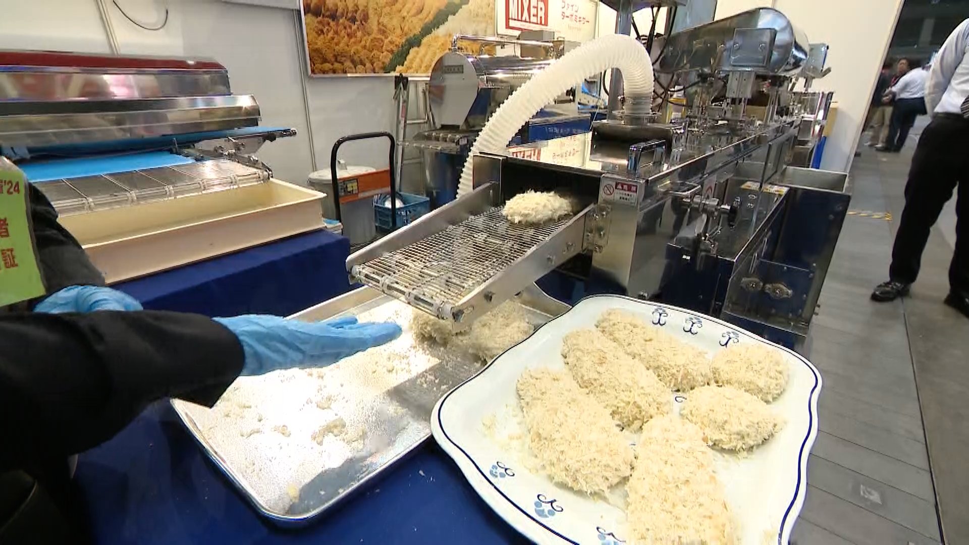 一方こちらの機械は、トンカツやコロッケなど揚げ物を調理する際、意外と面倒なパン粉を付ける作業をしてくれます。すでに全国のスーパーで使われているそうです。