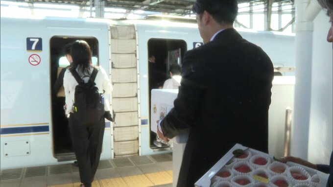 全国の特産品を新幹線で東京駅に運んで販売するイベントに向けて、福岡県のブランドトマトや和菓子が17日、新幹線で発送されました。