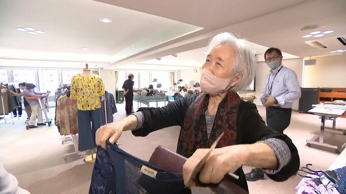 ブラウスや下着など約400点が施設の会議室に並び、多くの入居者が買い物を楽しみました。