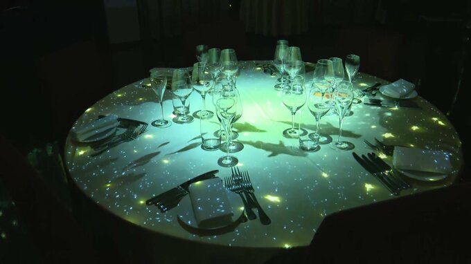 妖精が料理を作る様子などテーブルの上での細かい演出や、そこから壁面、会場全体へと広がる壮大な演出も体感できます。