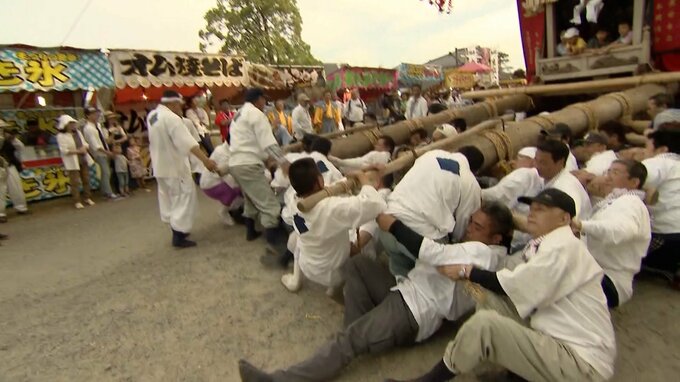 まず、車輪が付いた2基の曳山が100m離れた御旅所へ移動。