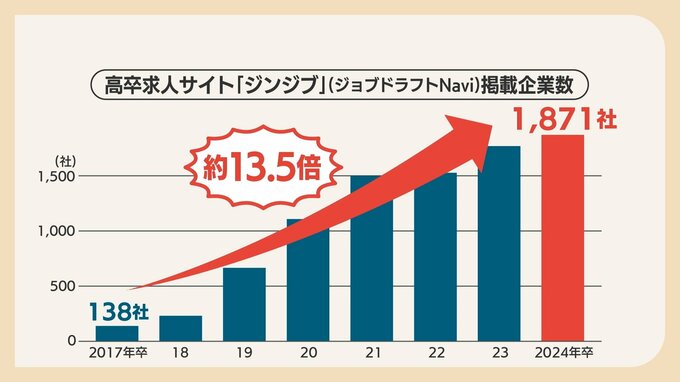 人手不足を背景に近年、高卒採用を希望する企業が急増しています。高卒求人サイト「ジンジブ」の今年の採用で登録している企業は1871社で、求人サイトを開設した8年前に比べて13倍以上に増えています。