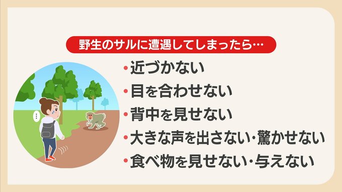 「大声を出したり、棒を振り回したりしない。サルは目をずっと見ると興奮してくることがあるので、目を見ずに。また、背中を見せると飛びかかってくることが多いので、できるだけ背中を見せずに後ずさりしながら避難してほしい。」