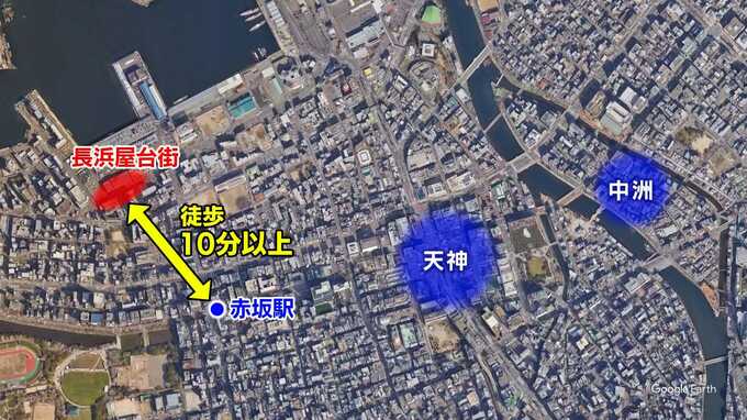 歓楽街の中洲や天神の繁華街から離れた場所にある長浜屋台街。最寄り駅の地下鉄赤坂駅からは歩いて10分以上かかることに加えて「知名度の低さ」も影響しているようです。