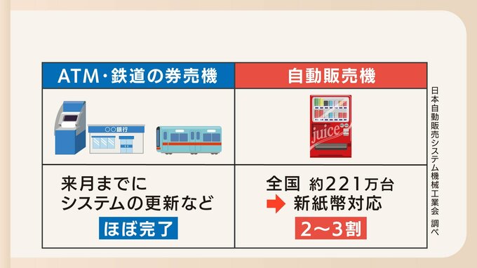 一方、全国に約221万台ある自動販売機のうち、新紙幣に対応できるものはまだ2~3割にとどまっているということです。