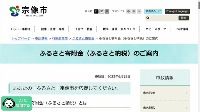 ふるさと納税した232人 住民税控除されず 市職員の確認ミスで 2024年6月5日(水) 18:38 国内 去年、福岡県宗像市に、ふるさと納税した人が、市の連絡ミスで住民税が控除されていなかったことがわかりました。確定申告せずに住民税の控除が受けられるワンストップ特例制度の適用をふるさと納税をした人の自治…