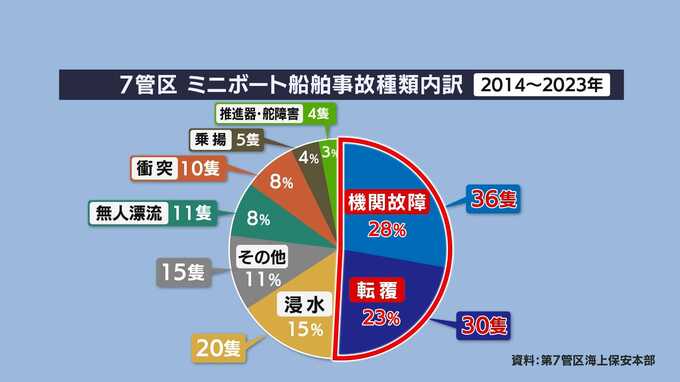 過去10年間のミニボート事故の原因をみると、エンジンの故障が28%、そして「転覆」が23%となっています。
