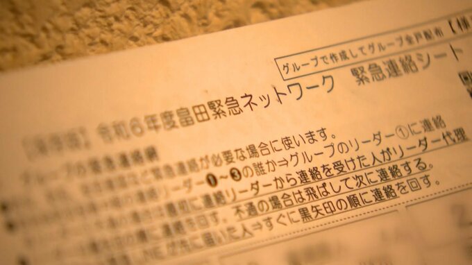 古川さんたちは、一人の犠牲者も出さない体制をつくろうと、3世帯から8世帯ごとにグループ分けを行いました。グループは、災害時には連絡網を使って「避難指示」などの情報を速やかに共有します。