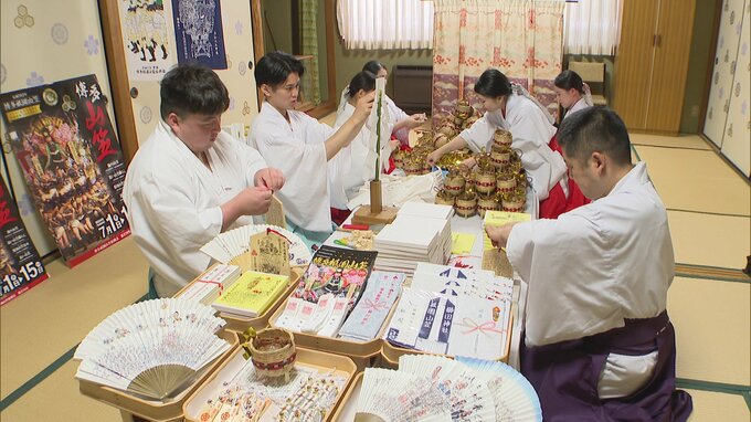 11日午前、福岡市博多区の櫛田神社では、神職と巫女たちが箱崎浜で取った砂を入れる「お汐井てぼ」に紙垂と呼ばれる紙をつけたり山笠の絵馬にひもをつけたりしていました。