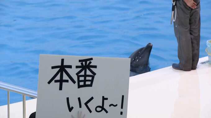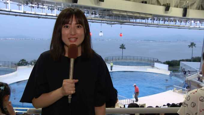 「こちらのエリアでは今まさにイルカショーが行われていますが、普段とは違う静かなショーなので水しぶきやイルカの声がよく聞こえます」