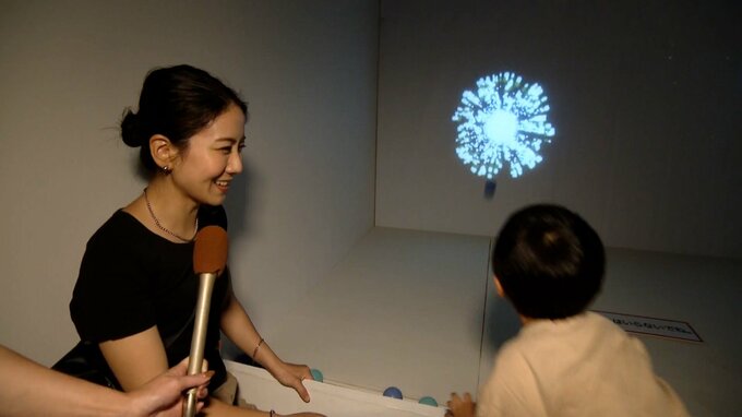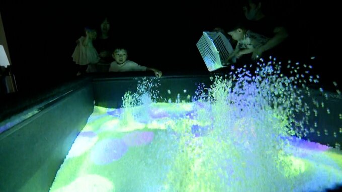 子供たちが夢中になって遊んでいたのが「スプラッシュディスプレイ」という作品です。動き回る的を狙って玉を投げ、見事当たると小さなビーズが爆発したように吹き上がります。