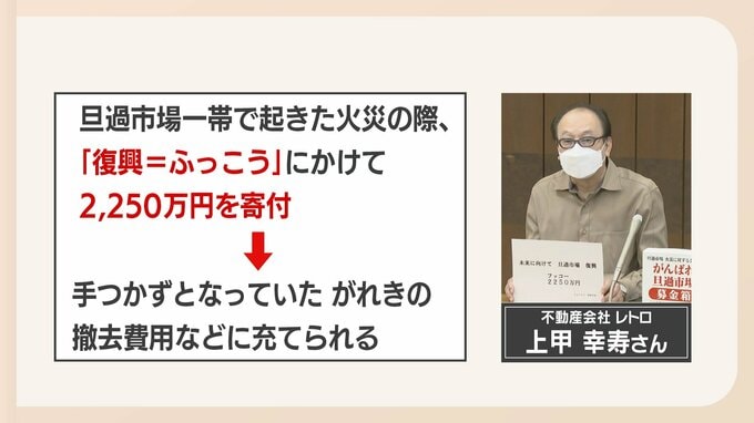 再開発を手掛ける地元の不動産会社、「レトロ」の上甲幸寿さんは、旦過市場一帯で起きた火災の際、「復興=ふっこう」にかけて、2250万円を寄付。