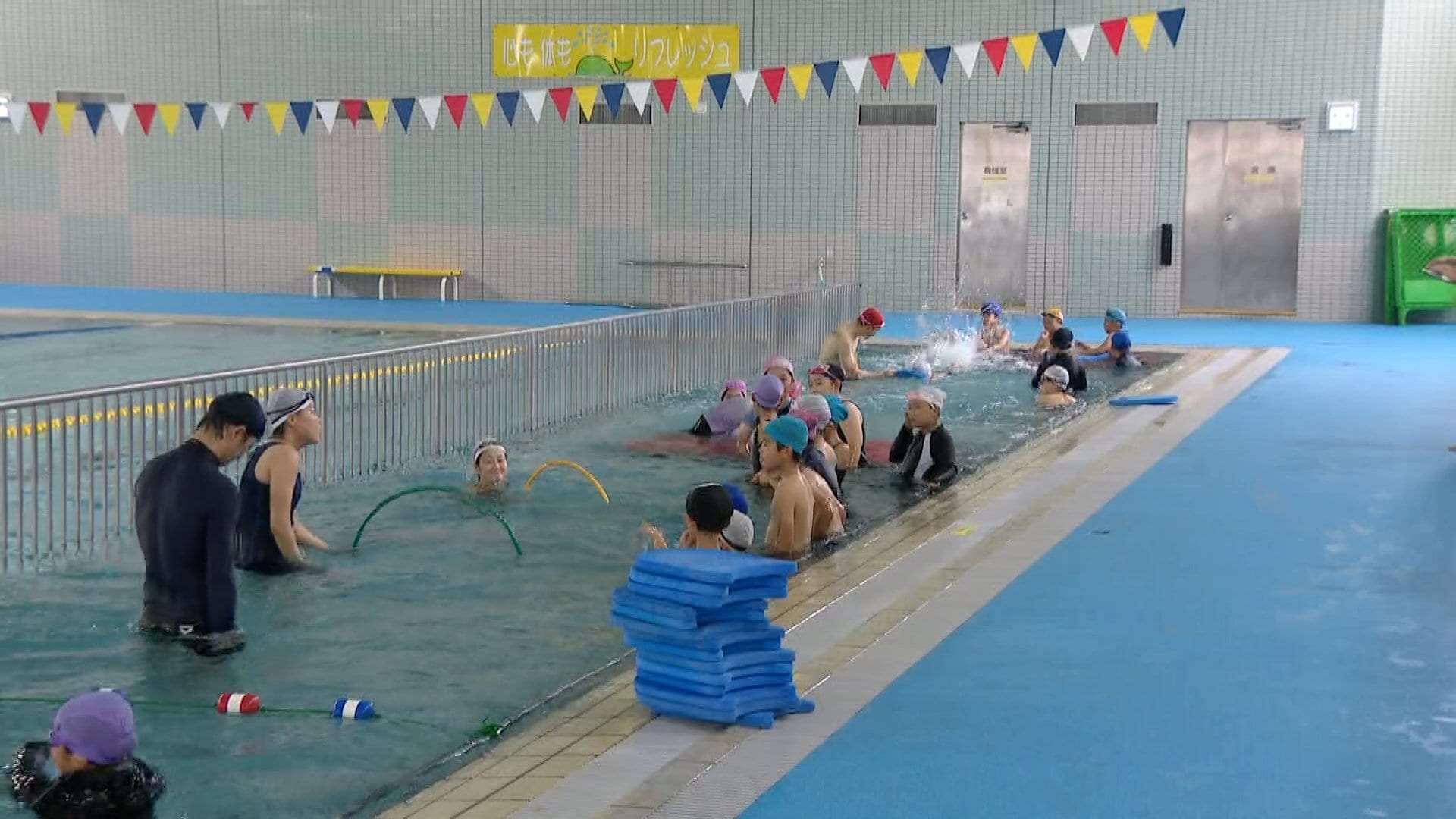 RKB本田奈也花アナウンサー「学校のプールに比べて場所が広々としています。そして、屋内ですので、きょう雨の予報なんですけど、その心配もありません。そしてさきほどから子供たちの元気な声が聞こえていますけど、グループごとに指導してもらえるところも1つメリットです。なにより楽しそうです」