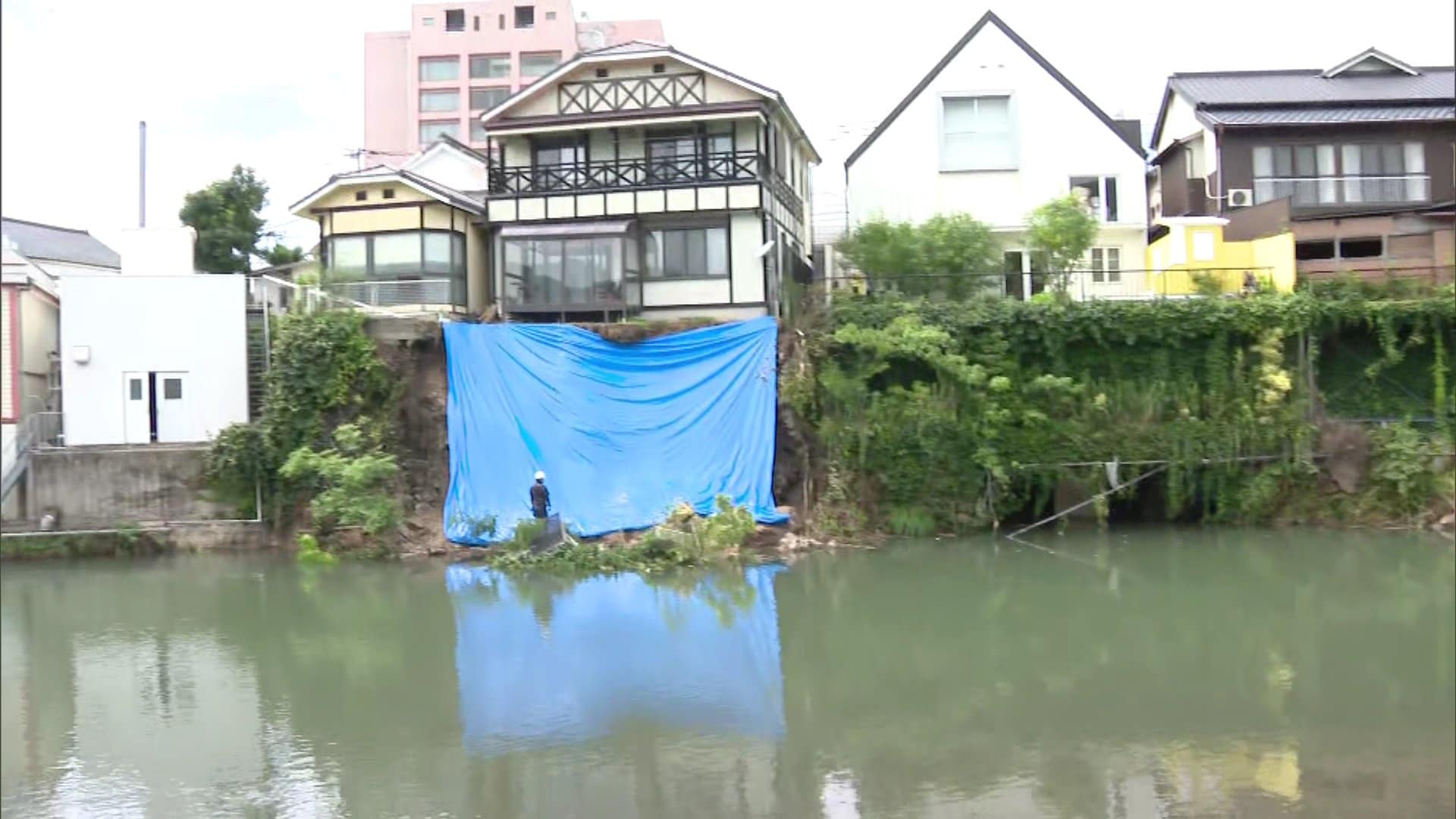 「佐賀県嬉野市の塩田川です。川沿いののり面なんですが、築100年の石垣があったということですが、それがきょうの朝崩れてしまったということです」