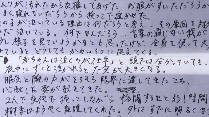 *日記「きょうもまた夜泣きが始まった。おしゃぶりを使ってみたり、途中でミルクをあげてみたり、やれることはやったつもりだったが、やはり寝てくれない。赤ちゃんは泣くのが仕事と頭では分かっていても、夜中にずっと泣かれると不安が大きくなる」