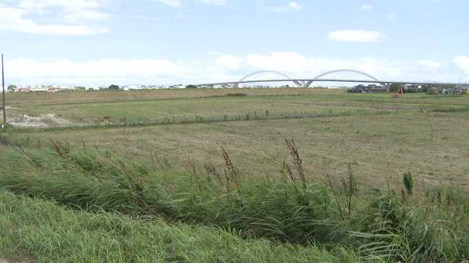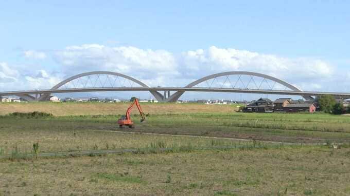 RKB毎日放送 植高貴寛記者「大川の駅の建設予定地、大川市の大野島に来ています。あたり一面に広大な土地が広がっています。現在地盤の改良工事が行われていて、建設予定の展望デッキから大川市のシンボル、昇開橋を眺めることができます。」