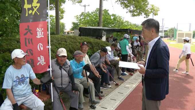 「大川市の将来を考える会」代表の江藤義行さんは、大川市役所のすぐ側の公園で「大川の駅」の計画見直しを求めて署名活動をしています。