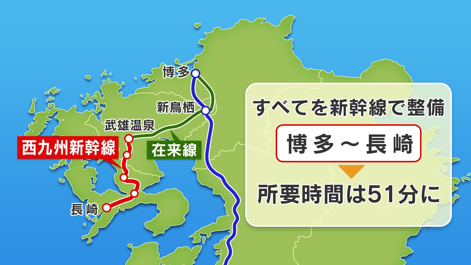 開業まで1か月となった西九州新幹線。長崎駅と佐賀県の武雄温泉駅を結ぶ、69・6キロの区間で運行を開始します。武雄温泉駅で在来線の特急列車と乗り換える「リレー方式」を採用。博多から長崎までの所要時間は最短で1時間20分と、現在より30分ほど短縮されます