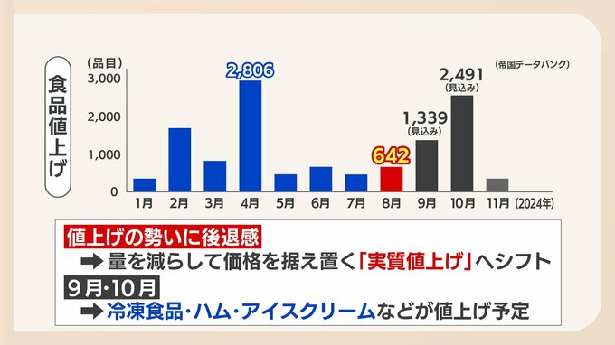 物流費の上昇や急速に進んだ円安が主な要因ですが、8月の平均値上げ率は12%で2024年に入ってから最も低い水準となっています。