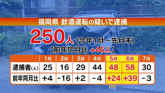 今年1月から先月末までに飲酒運転の疑いで福岡県警に逮捕されたのは、250人。特に新型コロナに関する行動制限が解除されてからは急増していて、5月は前の年の2倍、6月は3倍近くに上っています。