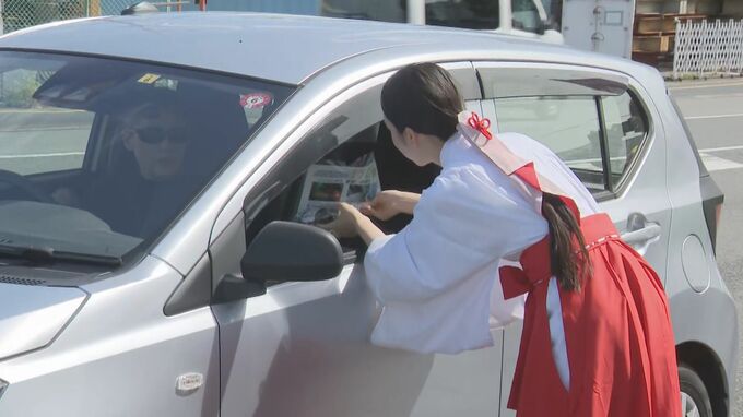 巫女たちは、「飲酒運転ゼロ」と書かれたラベルを貼った0キロカロリーのコーラをドライバーに配って飲酒運転撲滅を呼びかけていました。