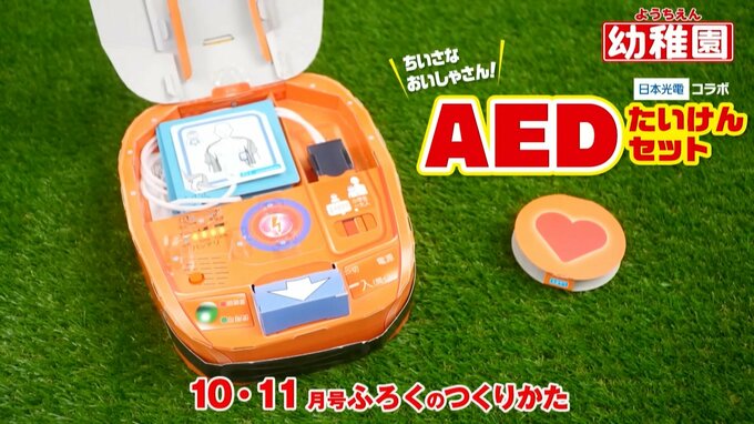 最新号の付録は、医療機器メーカーの「日本光電」とコラボした、「おやこで!AEDたいけんセット」。