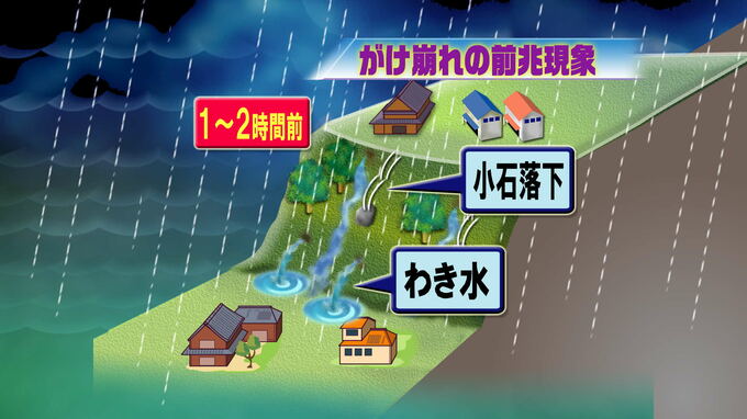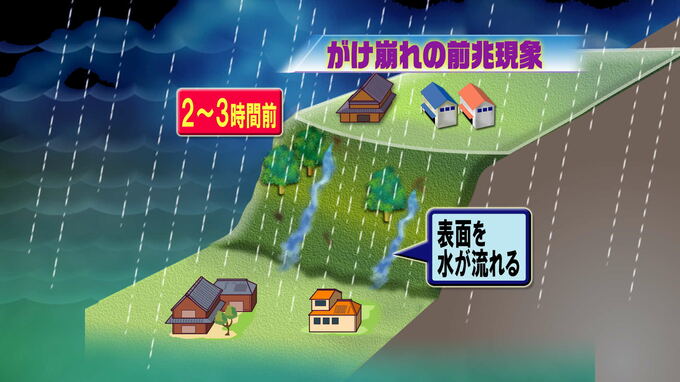 がけ崩れ発生の2時間~3時間前、がけの表面から水がわき出て流れます。