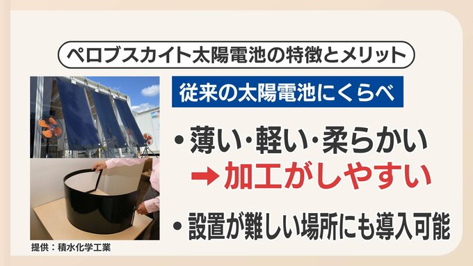 積水化学工業 PVプロジェクト 森田健晴ヘッド「ペロブスカイト太陽電池は、従来のシリコン系の太陽電池と比べると、重量は10分の1、厚みは20分の1ぐらいで、かなり薄くて軽くて柔らかい太陽電池で、今までつけられなかった所に、色々な所につけていけるのが特徴です。」
