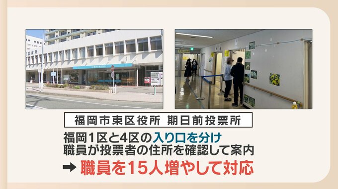 福岡市の東区役所では期日前投票所の入口を分けて、職員が投票者の住所を一人一人確認して案内しています。