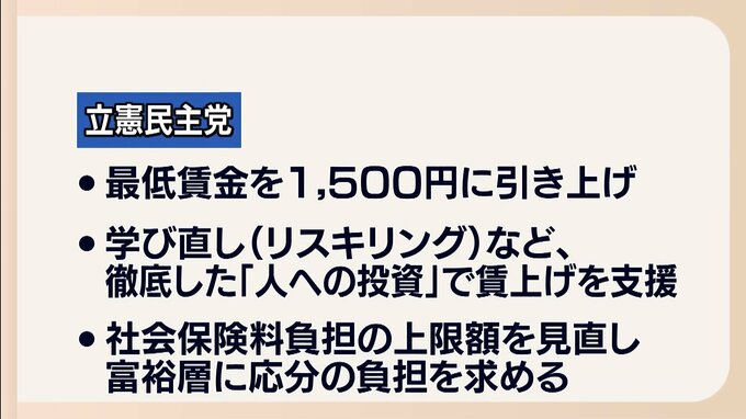 立憲民主党はリスキリングなど、徹底した「人への投資」で賃上げを支援したいとし、社会保険料については富裕層に応分の負担を求めます。