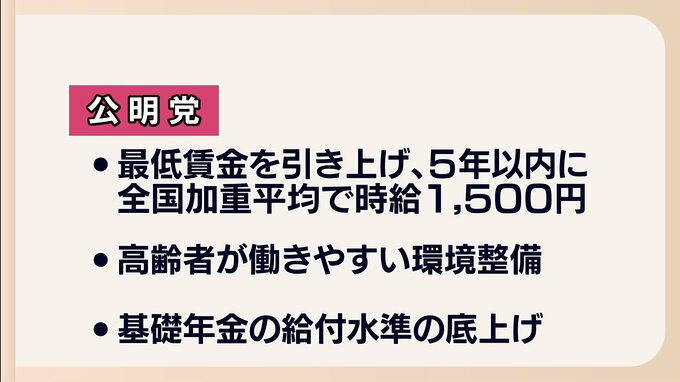 公明党は最低賃金を5年以内に全国加重平均で時給1500円にすることや、基礎年金の給付水準の底上げに取り組むとしています。