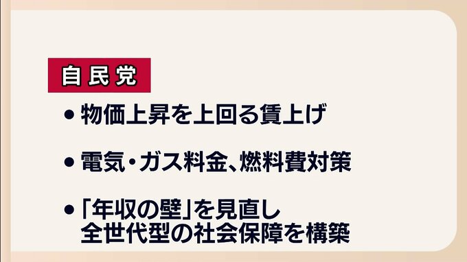 自民党は物価上昇を上回る賃上げに加え、いわゆる「年収の壁」の見直しや、全世代型の社会保障の構築を目指すとしています。