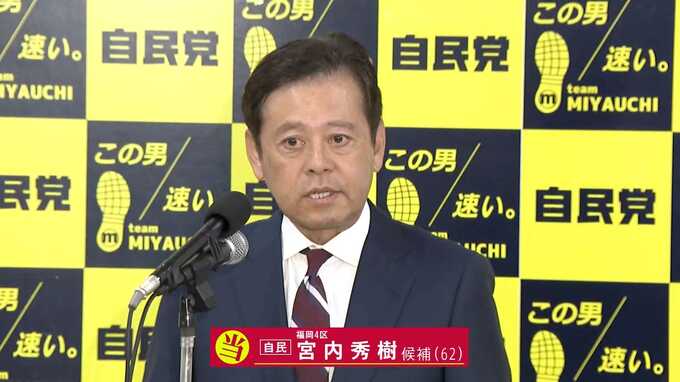 【当選確実】福岡4区 自民・宮内秀樹氏 2024年10月27日(日) 20:00 国内 27日に投票が行われた衆議院選挙で、福岡4区から出馬した宮内秀樹氏(62)の当選が確実となりました。福岡4区には、【自民・前】宮内秀樹氏(62)【無・新】吉松源昭氏(56)【維新・前】阿部弘樹氏(62)【参政・…