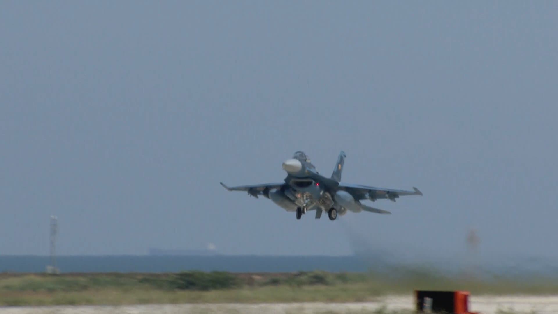 轟音とともに滑走路から飛び立つ、Fー2戦闘機。航空自衛隊築城基地(福岡県築上町)には2006年に導入され、西日本の空を守っています。